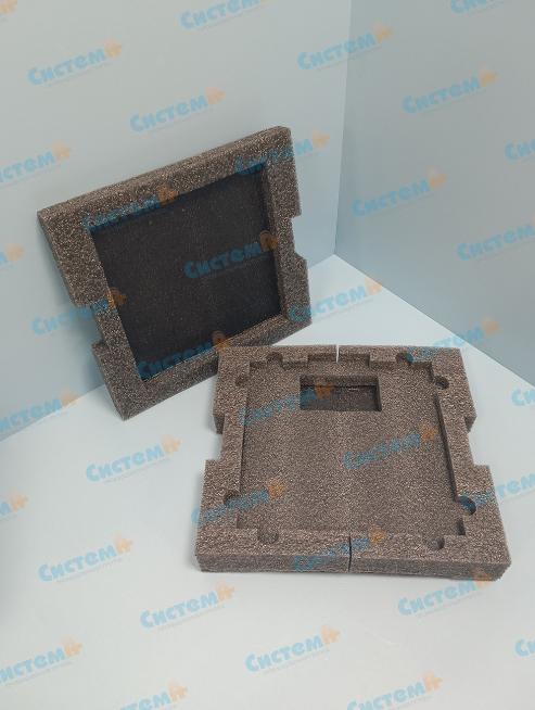 Решение получилось комплексным: сверху прочная коробка из гофрокартона и ложемент из серого несшитого пенополиэтилена внутри. Ложемент был изготовлен по индивидуальным размерам прибора, чтобы полностью исключить его смещение внутри коробки во время перевозки.